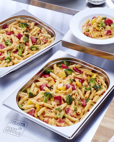 cooked penne pasta (water, DURUM WHEAT SEMOLINA) (28%), WHIPPING CREAM (10%), tomatoes (10%), red and yellow bell peppers, broccoli, WHOLE MILK, onions, fried red bell peppers (red bell peppers, sunflower oil), rapeseed oil, tomato purée, salt, garlic, water, herbs (basil, parsley), spices (paprika, cayenne pepper, lovage, turmeric, pepper, cloves, bay leaves), rice starch, sugar, maltodextrin, vegetable powder (parsnips, carrots), porcini powder.