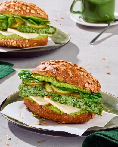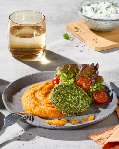 Veggie burger patty with a slightly spicy mix of peas, broccoli, kale and spinach leaves, combined with oat flakes, refined with parsley and amaranth flakes, and selected spices. The juicy veggie patty with small pieces of vegetables has a firm consistency, is pre-fried and quickfrozen.