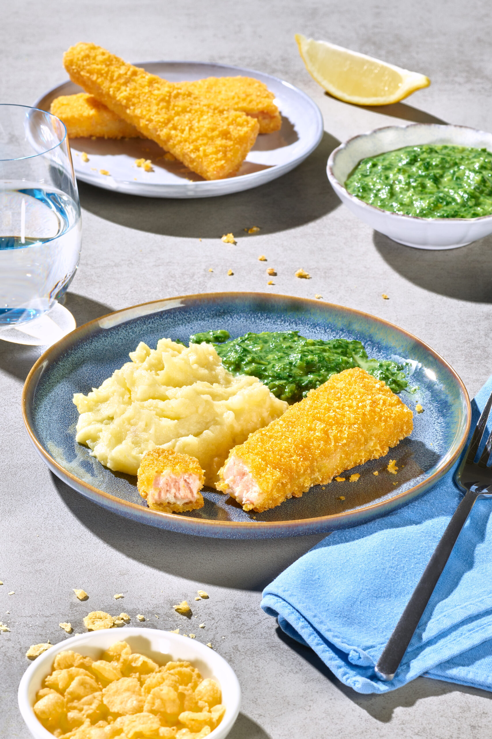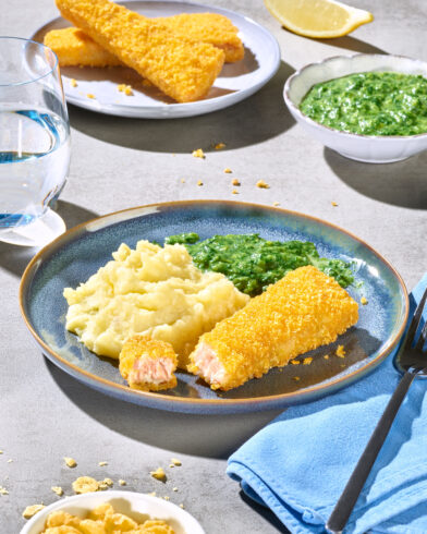 Salmon fillet in a crispy cornflakes coating. Trapezoid-shaped fillet portions from MSC-certified fisheries, virtually boneless, pre-fried until golden brown. Quickfrozen.