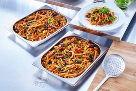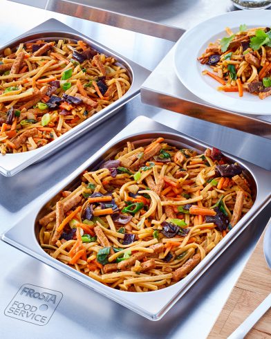 Cooked tagliatelle pasta (water, DURUM WHEAT SEMOLINA) (32%), soya protein preparation (rehydrated soya protein (water, SOYA PROTEIN CONCENTRATE), potato flakes, rapeseed oil, thickener methylcellulose, salt, dextrose, spices (pepper, garlic, lovage), vegetable powder (onions, parsnips, leeks, tomatoes), parsley) (16%), carrots, leek, savoy cabbage, onions, soya sauce (water, SOYA BEANS, WHEAT, salt) wood ear mushrooms, parsnips, bamboo sprouts, rapeseed oil, salt, spices (coriander, paprika, cumin, cayenne pepper, pepper), chilli paste (water, tomato purée, salt, spices (paprika, cayenne pepper), spirit vinegar, chillies), garlic.