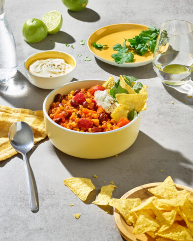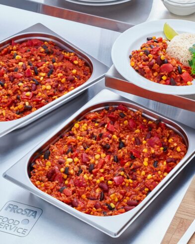 grated cauliflower, red bell peppers, tomatoes, water, vegan pea protein preparation (water, pea protein (2 %), coconut fat, onions, thickener methyl cellulose, pea fibres, spirit vinegar, maple sirup, smoked salt (salt, smoke), potato starch, spices (black pepper, garlic), beetroot powder, caramell sugar sirup, contains sunflower oil and/or rapeseed oil, concentrated lemon juice, spice extract) (10 %), sweet corn (9 %), cooked kidney beans (water, kidney beans, salt) (8 %), fried onions (onions, contains sunflower oil and/or reapeseed oil), tomato purée, cooked black beans (water, black beans), sunflower oil, tomato juice, spices (paprika, garlic, cayenne pepper, cumin), salt, vegetable stock (carrots, onions, leek, salt, water, extra virgin olive oil), rice starch.