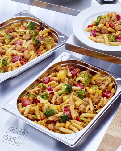 Cooked penne pasta (water, DURUM WHEAT SEMOLINA) (30 %), marinated, cooked chicken breast meat (chicken breast, salt, soybean oil, dextrose) (14 %), fried red bell peppers (bell peppers, sunflower oil), tomatoes, broccoli, onions, yellow bell peppers, WHIPPING CREAM, water, rapeseed oil, tomato purée, salt, garlic, spices (paprika, cayenne pepper, lovage, turmeric, pepper, cloves, bay leaves), sugar, vegetable powder (onions, parsnips, carrots), maltodextrin, porcini powder, parsley.