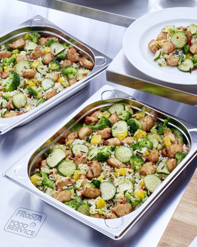 cooked rice (water, rice, salt) (35 %), vegetables in varying proportions (broccoli, courgettes, red peppers, yellow peppers) (35 %) , marinated cooked chicken breast meat (chicken breast meat, salt, soybean oil, dextrose) (18 %), BUTTER (4 %), cooked wild rice (water, wild rice, salt), water, olive oil, salt, sugar, rice flour, chillies, spices (lovage, turmeric, garlic, pepper, cloves, laurel), vegetable powder (onions, parsnips, carrots), maltodextrin, chicken fat, rapeseed oil, porcini powder, parsley.