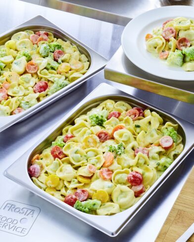 Cooked tortelloni pasta (water, DURUM WHEAT SEMOLINA, WHEAT FLOUR, WHEY CHEESE (RICOTTA), EGG, spinach, contains rapeseed oil and/or sunflower oil, HARD CHEESE, salt, nutmeg, yeast) (34%), water, romanesco, cherry tomatoes, CREAM (6%), yellow carrots, margarine (vegetable fats (palm, cocos), water, emulsifier mono- and diglycerides of fatty acids, acid citric acid), carrots, EDAM CHEESE (3%), BUTTER, starch (potato, rice), CURD, salt, rocket, sugar, rice flour, garlic, vegetable powder (onion, parsnips), maltodextrin, spices (lovage, turmeric, pepper, cloves, bay leaves), rapeseed oil, porcini powder, parsley.