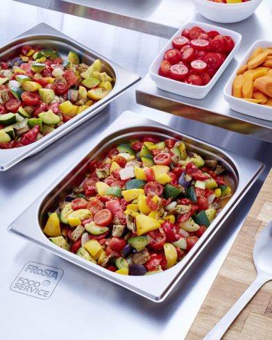 cherry tomatoes, yellow and green courgettes, grilled red peppers, onions, yellow peppers, grilled aubergines, water, extra virgin olive oil, salt, sugar, herbs (thyme, rosemary), pepper.