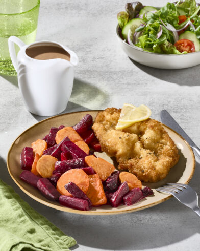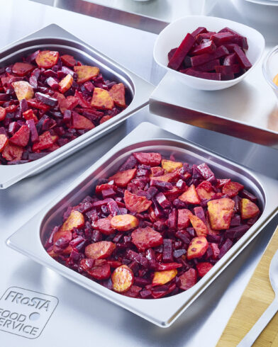 beetroot (51 %), fried sweet potatoes (sweet potatoes, sunflower oil) (30 %), water, BUTTER, olive oil, salt, sugar, starch (rice, potato), pepper.