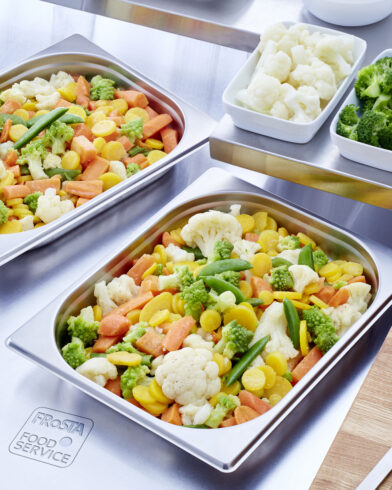 Cauliflower (20 %), yellow carrots, carrots, romanesco, sugar snaps, water, BUTTER (7 %), olive oil, salt, sugar, pepper.